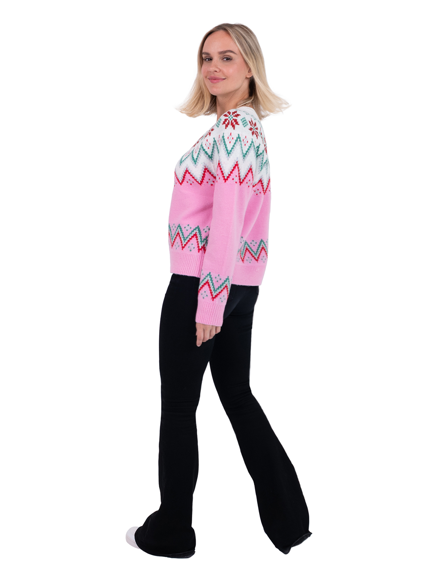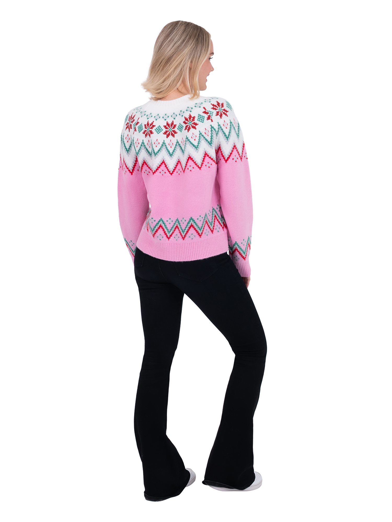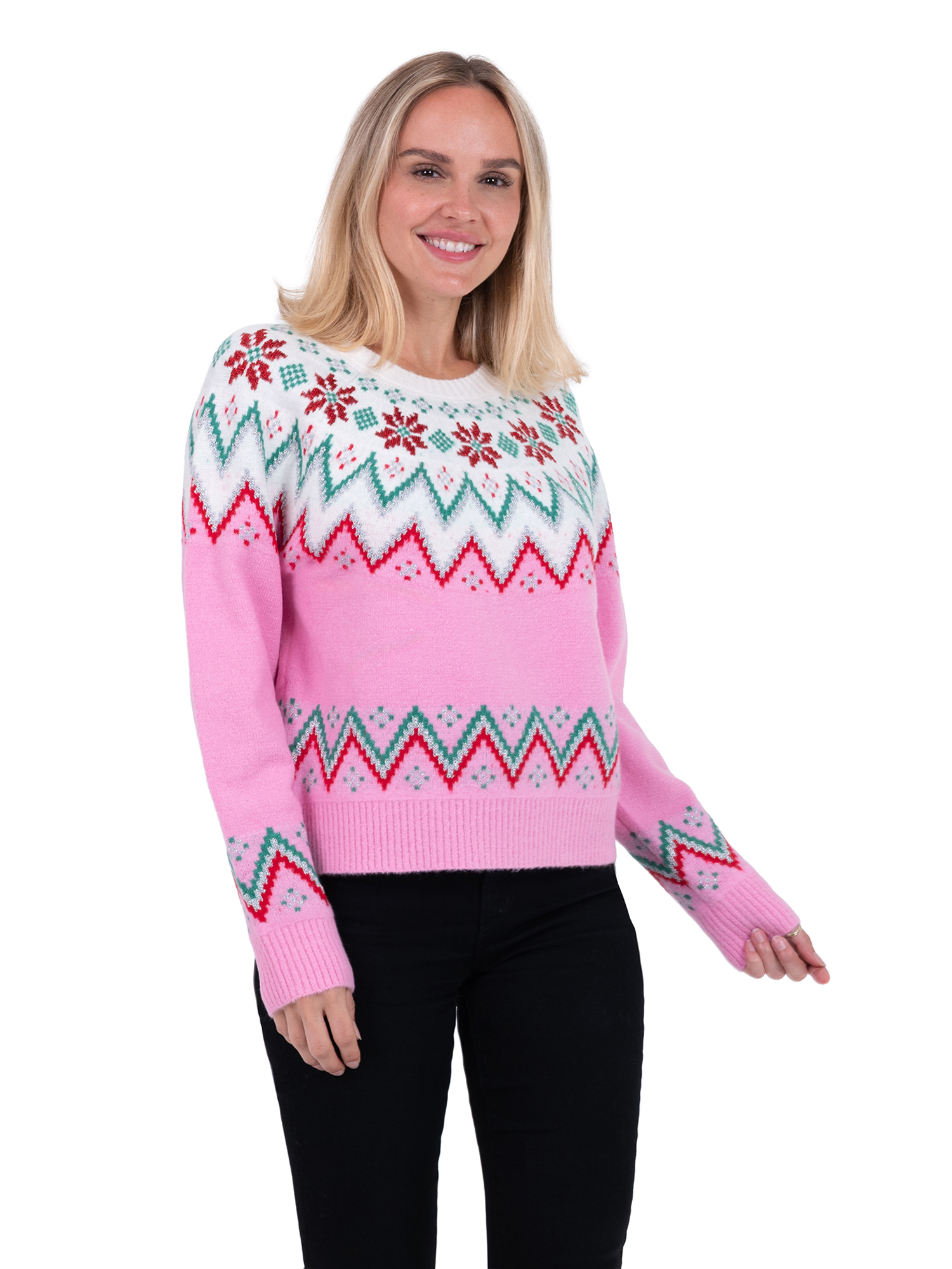 Celebrate the season in timeless style with the Jollidays Poinsettia Fair Isle Sweater. Featuring classic Fair Isle patterns accented with festive poinsettias, this long-sleeve crewneck brings traditional holiday elegance to your wardrobe. The soft knit offers warmth and comfort, making it perfect for cozy winter nights, festive dinners, and holiday photos. Its versatile design pairs beautifully with denim, skirts, or leggings, so you can dress it up or keep it casual. Available in sizes S–XXL, this sweater is a seasonal staple that blends festive patterns with everyday wearability—making your holiday look effortlessly joyful.
